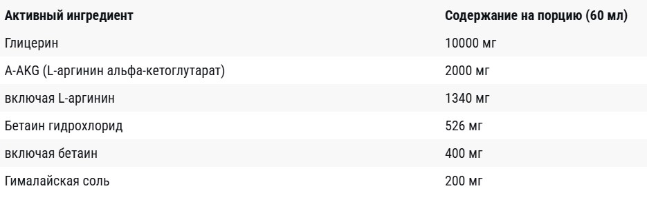 Состав: вода, яблочный сок из концентрата (20%), глицерин, L-аргинин альфа-кетоглутарат (A-AKG), бетаин гидрохлорид, гималайская соль, регулятор кислотности (лимонная кислота), ароматизаторы, подсластители (ацесульфам К, сукралоза, неотам), консерванты (сорбат калия, бензоат натрия).