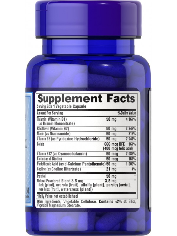 Комплекс витаминов группы В от Puritan's Pride B-Complex 50 (50 таб.) - это полный спектр витаминов группы В. Витамины группы В являются одними из самых необходимых для нашего организма в условиях современного образа жизни. Стресс и физические нагрузки требуют повышенного их количества и способствуют выведению этой группы витаминов из организма.