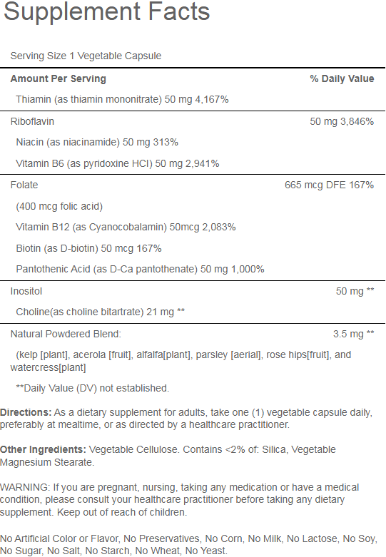 Витамины группы В действуют более результативно в комплексе, чем работа каждого витамина В по отдельности. Комплекс витаминов Mega B-150 содержит B-1, B-2, ниацин, B-6, инозит, ПАБА, пантотеновую кислоту и холин, а также B-12, биотин и фолиевую кислоту которые необходимы для полноценного усвоения питательных веществ (белки, жиры, углеводы), нормализации работы всего организма.