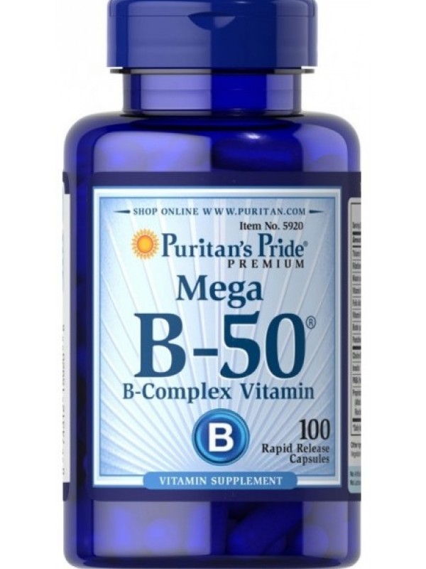 Puritan's Pride Mega B-50 - витамины группы В (В1, В2, В6, ниацин, фолиевая кислота, В12, биотин, пантотеновая кислота), а также ПАБК, инозитол, холин битартрат, и специальная смесь (люцерна, кресс-салат, петрушка, соевый лецитин, рисовые отруби).