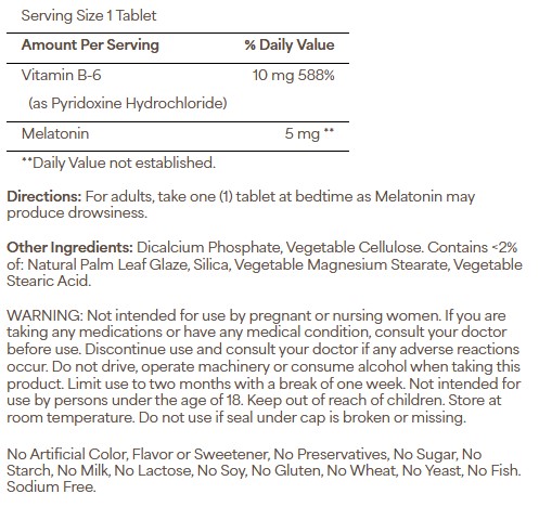 Melatonin 5 mg with B-6 - Мелатонин важен для естественного цикла сна и способствует спокойному сну. Мелатонин отлично подходит тем, кто страдает от смены часовых поясов или периодической бессонницы. Мелатонин помогает быстро заснуть и дольше спать.
