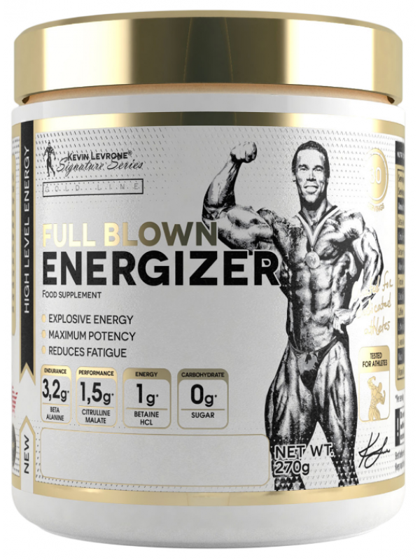 Full Blown Energizer - многокомпонентный предтренировочный комплекс с новейшей линейки товаров от Кевина Леврона Gold Line. Он обеспечивает стимуляцию, необходимую для интенсивных тренировок, максимально повышает физическую работоспособность, придает силы и энергии. В данной добавке производитель главный акцент поставил на энергетической составляющей продукта. Такие вещества, как кофеин, тирозин, теанин, благоприятно влияют на центральную нервную систему, увеличивают мотивацию, улучшают способность к концентрации и повышают уровень энергии.
