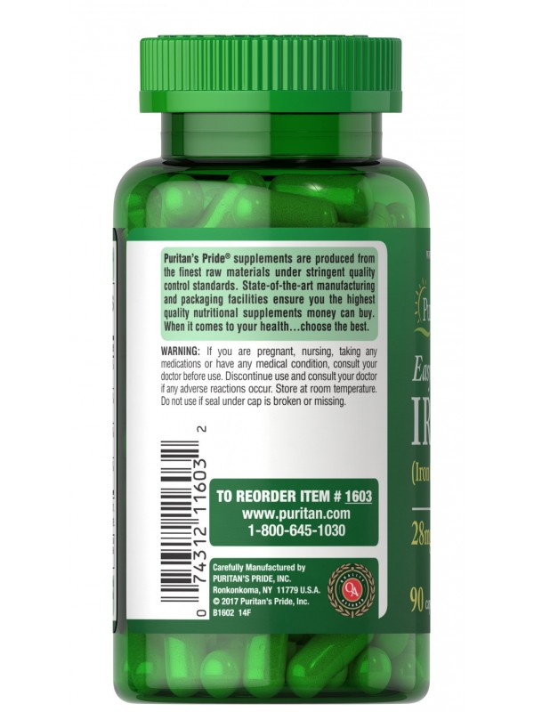 Puritan's Pride Easy Iron Glycinate 28 mg (90 капс.) - является важным пищевым источником железа. EASY IRON содержит бисглицинат железа, хорошо переносимую форму железа, которая не оказывает вредного воздействия на ваш организм.