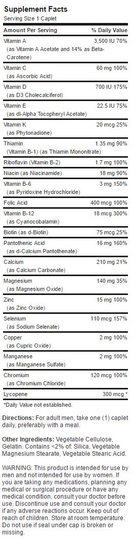 Другие ингредиенты: ниацин, витамин В6, фолиевая кислота, витамин В12, пантотеновая кислота, биотин, кальций, магний, селен, цинк, ликопин, калий, селен, медь, стеариновая кислота, целлюлоза, диоксид кремния.