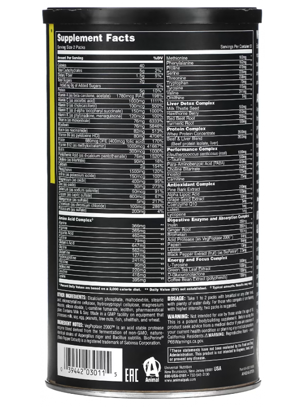 Используйте один (1) пакет Animal Pak с завтраком или другим этапом приема пищи с значительным количеством воды. Для тех, кто подвергается спортивной конкуренции или занимается с более высокой интенсивностью, допустимо использовать два (2) пакета в день, делая перерыв между ними в 4-12 часов.
