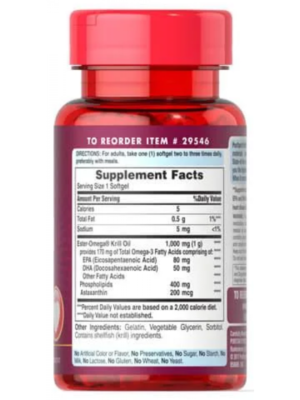 Масло криля Puritan's Pride Red Krill Oil 1000mg (30 капс.) – высококачественная и полезная для человеческого здоровья пищевая добавка на основе качественного масла криля. Это источник не синтезируемых организмом человека кислот ЕРА и ДГК в высоком количестве, способный эффективно восполнить недостаток в организме Омега 3.